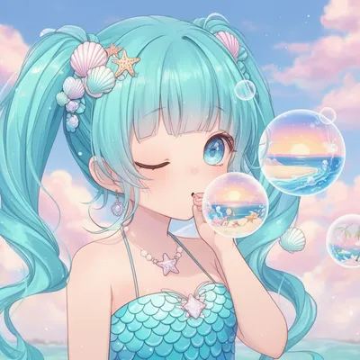 KawaiiAdorable anime-style digital avatar featuring a cute mermaid girl with turquoise twintails, seashell accessories, and magical ocean bubble scenes.
