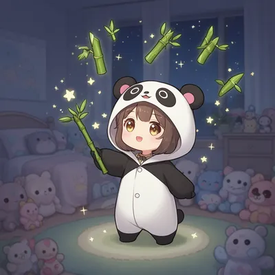 Adorable kawaii-style AI avatar featuring a chibi girl in panda kigurumi casting magical spell with whimsical bamboo and starry effects.