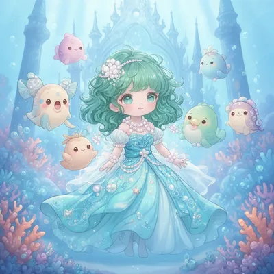 KawaiiAdorable underwater-themed kawaii avatar with sea-green wavy hair, pearl accessories, and charming marine creature companions in a soft blue aesthetic.