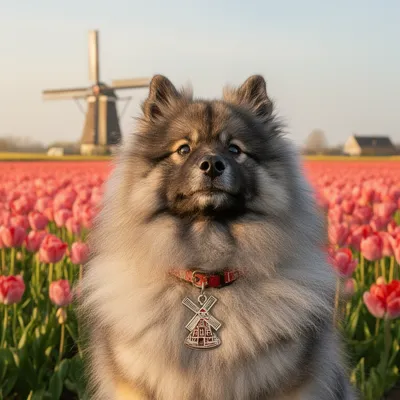 PetsAuthentic Dutch Keeshond breed avatar with distinctive spectacle markings, fluffy gray and cream coat, windmill charm, traditional tulip landscape background.