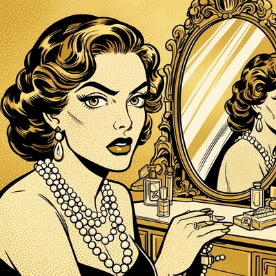 Pop ArtVintage Lichtenstein-inspired AI avatar with dramatic side-eye, golden halftone style, vintage beauty graphic design with sophisticated pop art aesthetic.