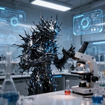 MonstersFuturistic sci-fi AI avatar featuring a shape-shifting liquid metal creature with spiky metallic form exploring a high-tech laboratory environment.