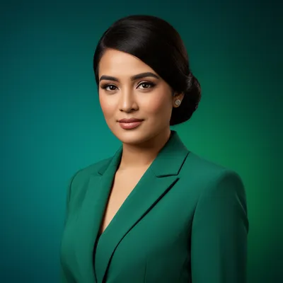RealisticSophisticated AI-generated portrait of a Malaysian woman in a jade green blazer with sleek French twist hairstyle, perfect for professional profile imagery.