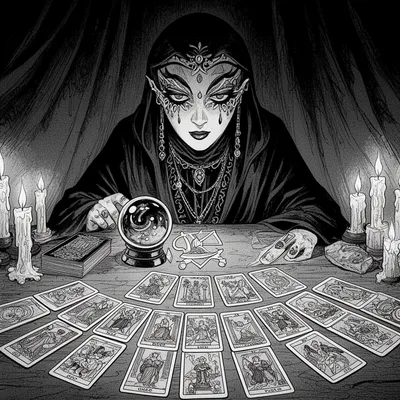 MangaCaptivating AI-generated manga avatar of an enchanting fortune teller with intricate eye makeup, tarot cards, and mystical crystal ball atmosphere.
