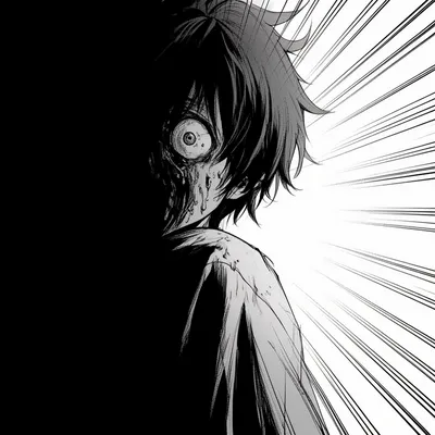 Intense manga-style avatar capturing psychological horror with dramatic contrast, single wide eye revealing pure terror against dark shadows and speed lines.