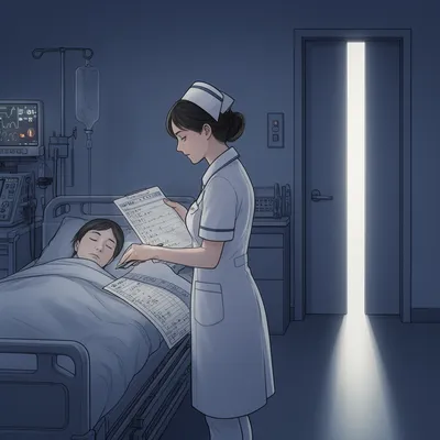 Detailed manga-style AI avatar of a compassionate nurse on night shift, featuring intricate medical details and soft artistic linework in a hospital setting.