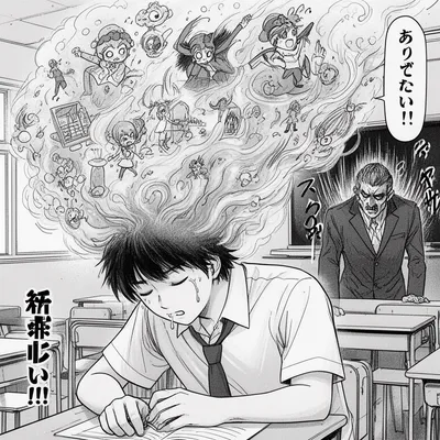 MangaWhimsical AI-generated manga avatar depicting a comedic student dozing off in class with surreal dream sequence emerging dramatically around their head.