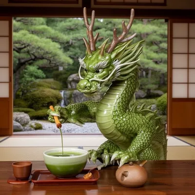 Elegant AI-generated avatar featuring a matcha green tea dragon with ceramic scales performing a traditional Japanese tea ceremony in a serene zen environment.
