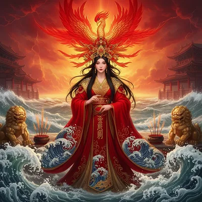 MythicalEthereal Chinese mythological avatar featuring divine sea goddess Mazu in elaborate phoenix crown, warm golden light, and intricate maritime ceremonial robes with mystical ocean details.