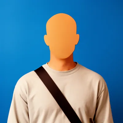 MinimalistClean, geometric AI avatar portrait featuring a stylized man with messenger bag, steel blue background highlighting minimalist design and bold diagonal composition.