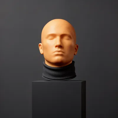 MinimalistElegant AI-generated avatar featuring a minimalist portrait of a man in a dark turtleneck, with a sculptural geometric design and warm facial rendering against a charcoal background.
