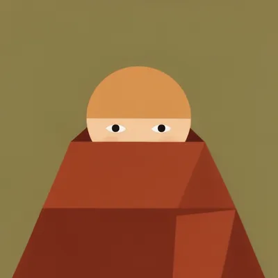 MinimalistElegant minimalist AI-generated portrait with warm olive background, featuring a cozy red geometric scarf and subtle human eyes in a stylized circular design.