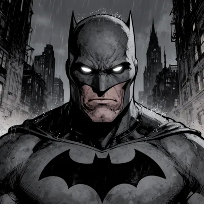 SuperheroesGritty noir superhero AI avatar with armored grey face, intense white glowing eyes, and bat-symbol chest armor in dramatic gothic cityscape style.