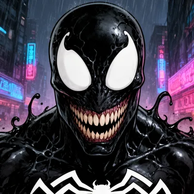 SuperheroesDark and intense horror comic style superhero avatar with black symbiote face, menacing white eyes, sharp teeth, and dramatic city background.
