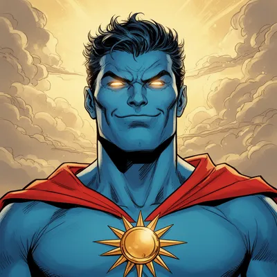 SuperheroesDynamic blue-skinned monster superhero avatar with glowing eyes and golden sun emblem, crafted in classic comic book illustration style with dramatic heroic portrait.