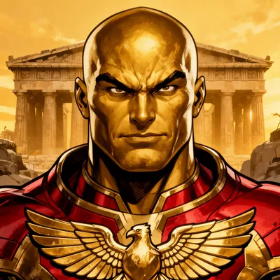 SuperheroesDynamic AI-generated monster superhero avatar with golden skin, intense gaze, red and gold eagle armor, featuring legendary comic book style heroic portrait.