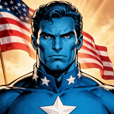 Dynamic AI-generated superhero monster avatar with intense blue patriotic style, featuring determined eyes and noble comic book aesthetic for unique profile imagery.