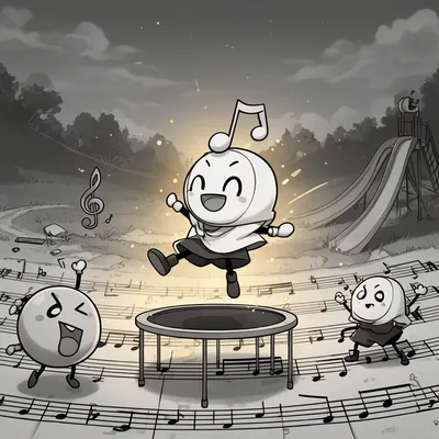 Cute super-deformed chibi avatar of a bouncy musical note character with animated staff lines, treble clef, and musical elements in a classic black and white style.