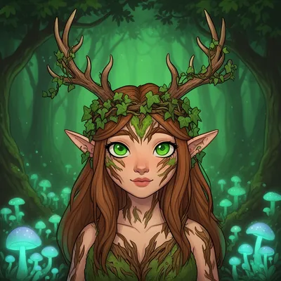 Magical cartoon avatar featuring a mystical druid with antler crown, forest-green eyes, and ethereal bioluminescent woodland aesthetic for fantasy profile imagery.