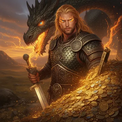 MythicalEpic fantasy AI avatar featuring a fierce Norse dragon-slayer with blazing blue eyes, golden hair, and intricate Viking armor crafted from legendary dragon-gold.