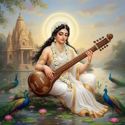 Ethereal AI-generated avatar of Hindu goddess Saraswati in transcendent musical pose, featuring divine radiance, sacred lotus, and mystical fantasy art style.