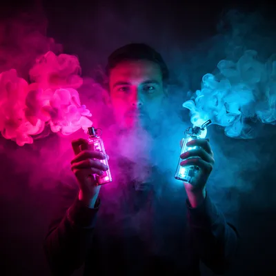 Neon GlowDynamic AI-generated avatar with luminous pink and blue smoke effect, showcasing futuristic neon portrait style with dramatic LED-illuminated facial features emerging from colorful fog.