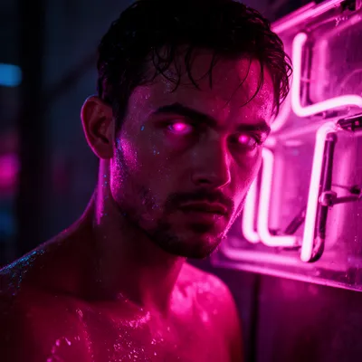 Neon GlowMoody cyberpunk AI-generated avatar with wet skin, pink neon reflections, intense dark eyes, and a glistening atmospheric aesthetic perfect for digital profiles.