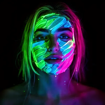 Neon GlowMesmerizing AI-generated avatar with luminescent neon paint strokes creating an ethereal, cyberpunk-inspired portrait against a dark background.