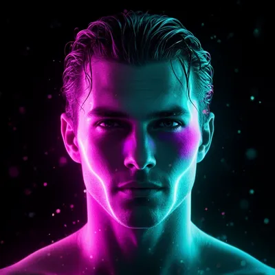 Neon GlowDynamic AI-generated avatar featuring a sharp-jawed man in vibrant magenta and cyan neon lighting, creating dramatic purple shadows and ethereal atmosphere.