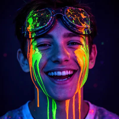 Neon GlowElectrifying AI-generated avatar with fluorescent paint drips, UV-lit face, and paint-splattered goggles in a bold neon cyberpunk art style.