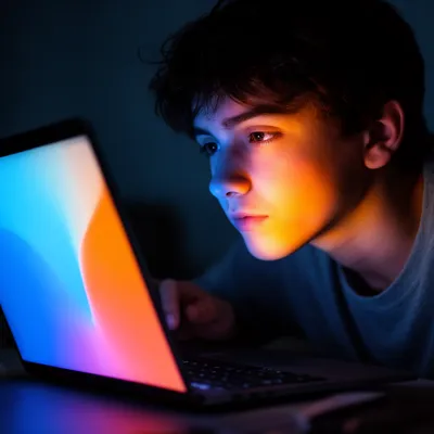 Neon GlowFuturistic AI avatar with vibrant neon blue and orange gradient lighting, capturing a young person's intense digital workspace moment in stunning illumination.