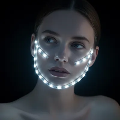 High-fashion AI avatar featuring a woman with luminous LED strip contours, cool white light accenting her bone structure in a cutting-edge digital art style.