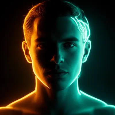 Neon GlowVibrant AI-generated avatar with split neon lighting, featuring warm amber and cool teal tones in a striking digital portrait style.