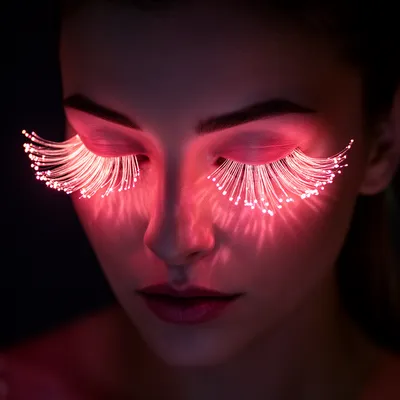 Neon GlowStunning AI-generated avatar featuring a woman with luminous fiber-optic eyelashes in warm pink, casting delicate shadows in a mesmerizing neon art style.
