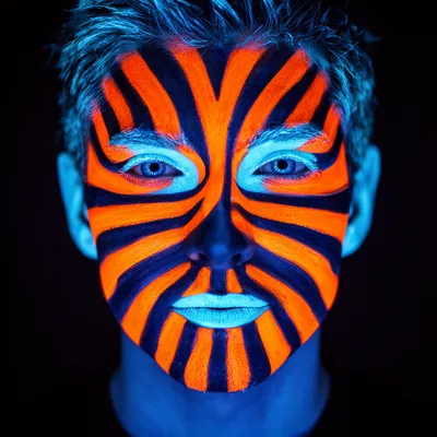 Neon GlowLuminous AI-generated avatar with UV-reactive orange stripes creating a bold geometric portrait in striking Day-Glo neon art style.