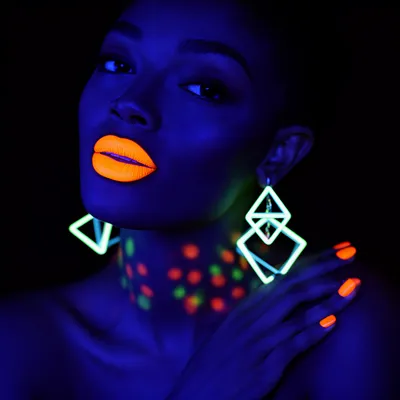 Neon GlowVibrant UV-reactive AI avatar featuring a dark-skinned woman with fluorescent orange lipstick, geometric neon earrings, and a deep indigo luminescent aesthetic.