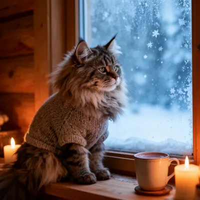 PetsAdorable fluffy Norwegian Forest cat AI avatar in a tiny knitted sweater, capturing a serene winter moment with soft warm cabin lighting and snowflakes.