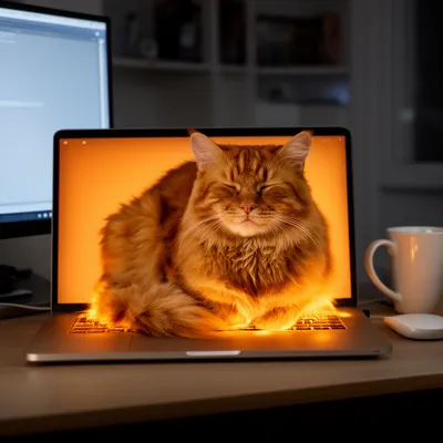 Professional digital avatar featuring a cozy orange cat lounging on a laptop keyboard, capturing the charming essence of feline workplace companionship.