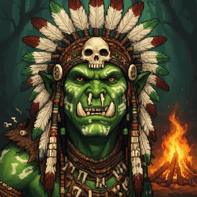 Pixel ArtUnique pixel art avatar featuring a fierce green-skinned orc shaman with bone piercings, feathered headdress, and tribal markings in classic 16-bit RPG aesthetic.