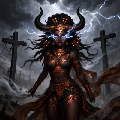 Epic Yoruba mythology-inspired AI avatar featuring a fierce storm goddess with lightning eyes, buffalo horns, and dynamic wind-swept ceremonial attire.
