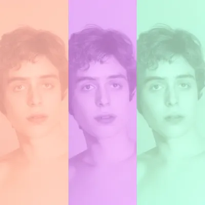Trendy AI-generated portrait in classic vaporwave style with pastel color panels, creating a modern digital art avatar with retro pop art influence.