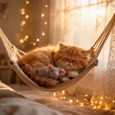 Peaceful AI-generated avatar of a cute Persian kitten sleeping in a soft hammock, capturing serene pet portrait with warm, dreamy lighting and magical atmosphere.
