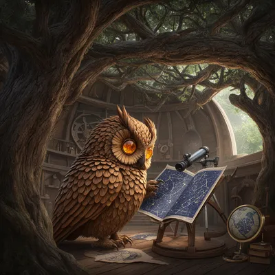 Enchanting AI avatar featuring a mystical wooden owl with layered scale feathers, amber eyes, and astronomical design perfect for fantasy enthusiasts.