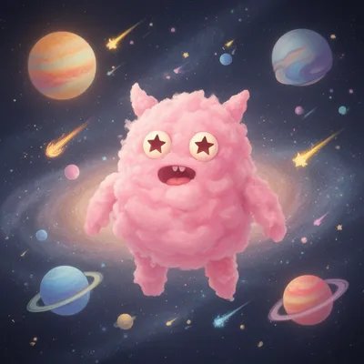 MonstersWhimsical AI avatar featuring a soft pink monster with star-shaped eyes, floating ethereally in a vibrant galaxy with colorful planets and magical glow effects.