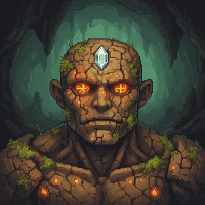 Pixel ArtUnique pixel art avatar featuring a mystical stone golem with glowing rune eyes, moss details, and crystal forehead, perfect for dungeon crawler and fantasy game profiles.
