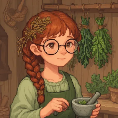 Pixel ArtCharming pixel art avatar of a young herbalist with freckles, glasses, and auburn hair, featuring a warm cottagecore aesthetic and herbal crafting style.