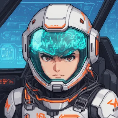 Pixel ArtDynamic pixel art avatar featuring a determined mech pilot with neural interface helmet, blending tech-inspired design and retro gaming aesthetic in white and neon orange.