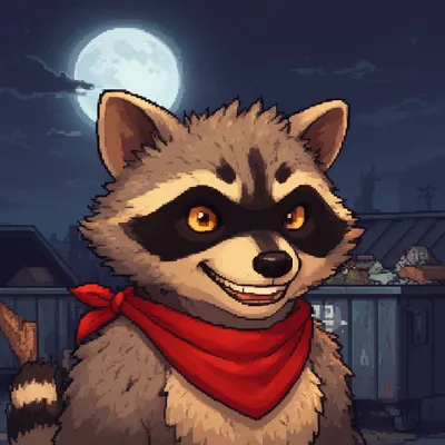 Pixel ArtCharming indie-style pixel art avatar featuring a mischievous raccoon character with detailed fur, masked face, and playful red bandana in a warm retro palette.