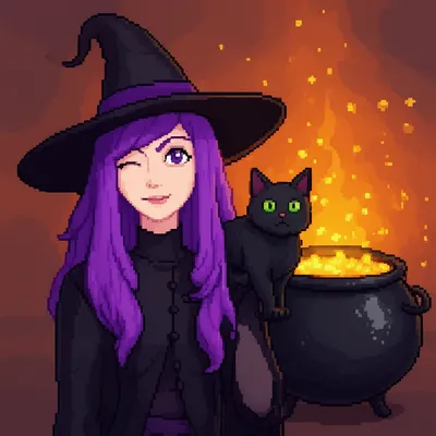 Pixel ArtNostalgic pixel art avatar featuring a whimsical witch with purple hair, winking eye, and black cat in classic 8-bit game style with magical Halloween atmosphere.