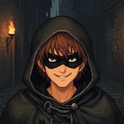 Pixel ArtRetro 16-bit pixel art avatar featuring a shadowy thief character with brown hair, black mask, and dark cloak in nostalgic SNES gaming style.